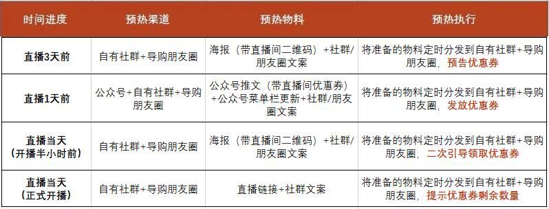直播1天前。这一阶段的预热渠道主要增加了公众号,适用公众号有一定粉丝基础的商家。如果商家没有公众号但有一定预算,也可以选择目标公众号投放广告。